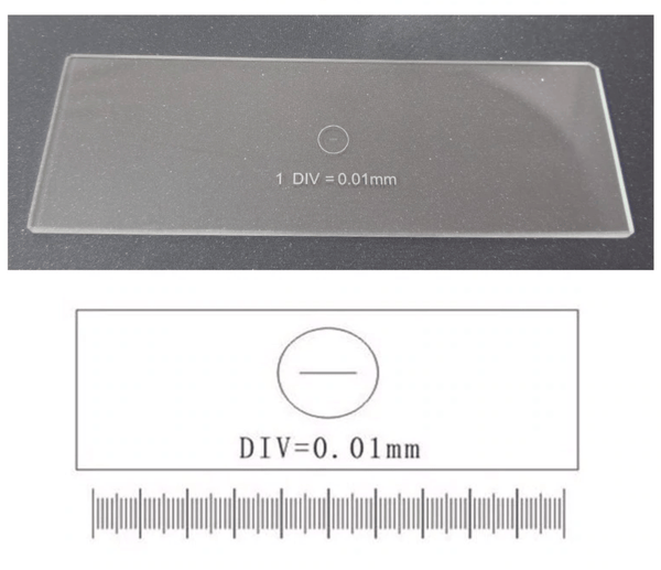 You would like to determine your real magnification but a normal ruler is not exact enough? This basic micrometer calibration tool has 1/100 mm (0.01 mm) markings on the glass. The tool comes together with a plastic case.
