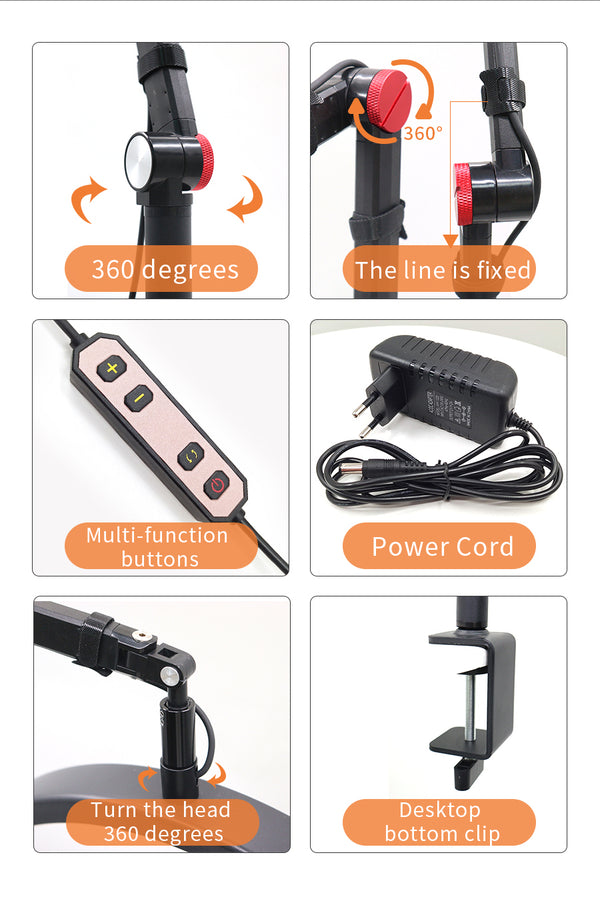 Die kompakte und leichte Bauweise erleichtert die Handhabung. Mit dem stabilen Klemmen-Fuß kann die Leuchte an Tischplatten bis ca. 6 cm Dicke befestigt werden. Der flexible Gelenkarm und die um 360° drehbare Leuchte ermöglichen eine individuelle Ausrichtung.